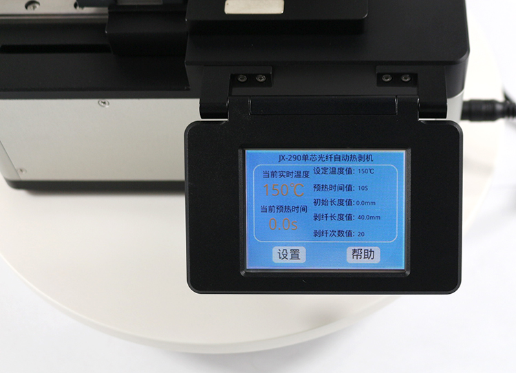 1、配备一块2.8寸真彩液晶触摸显示屏,能够实时显示剥纤温度、剥纤长度、检测剥纤次数以及用户帮助等参数信息;
